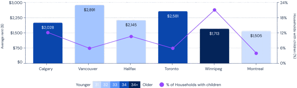 In Winnipeg, 21.4% of renters have children, and the city’s renters have the oldest median age in Canada (34.1). This indicates that Winnipeg offers greater affordability for renters seeking to start families.