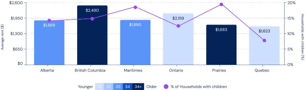 Higher rents tend to coincide with older renter populations, while provinces with lower rents (like the Prairies and Quebec) see a higher share of households with children.