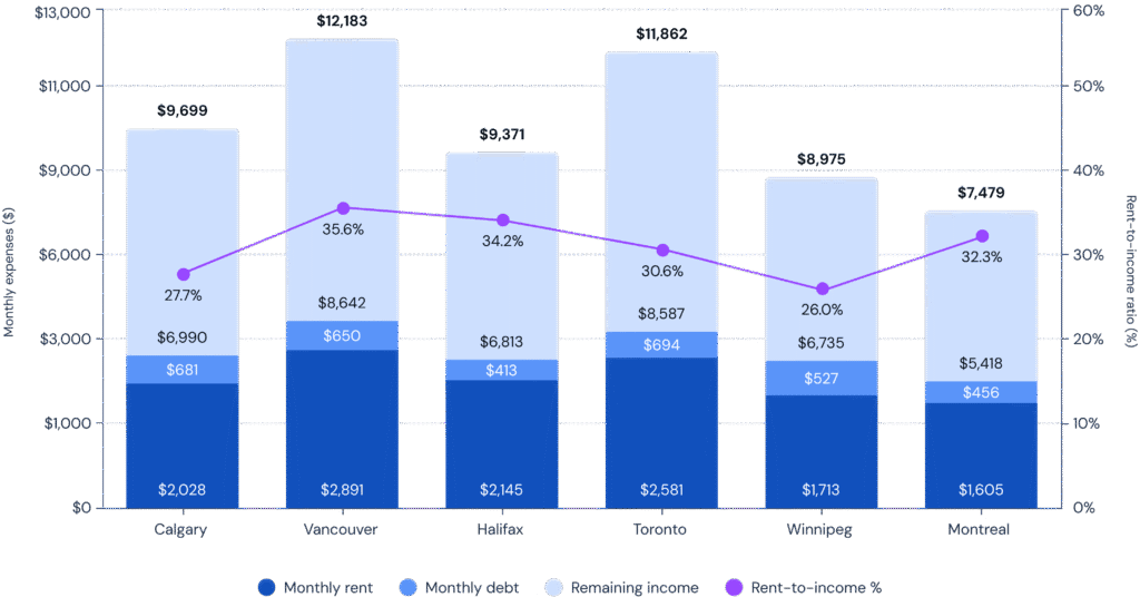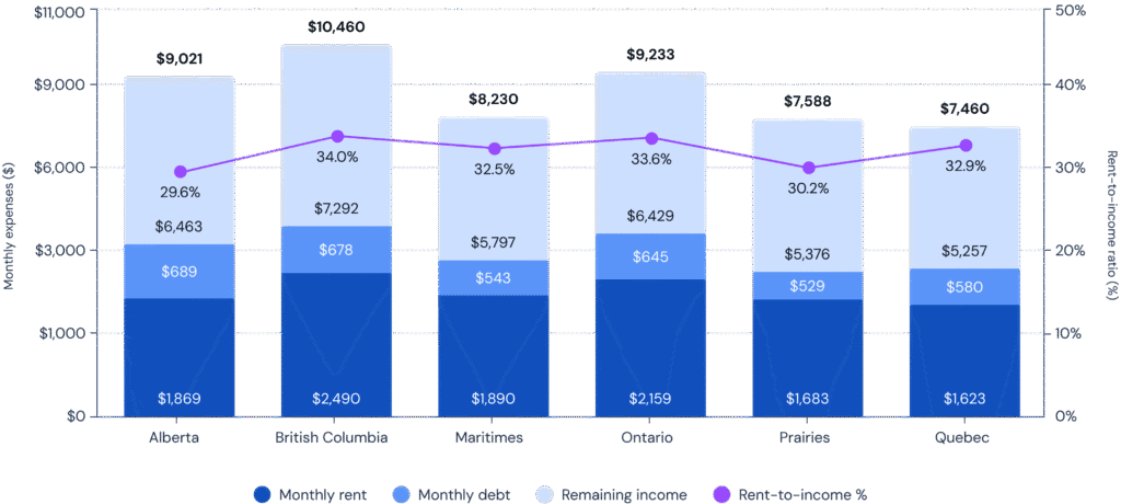 Despite regional income differences, renters across Canada face similar affordability pressures. Rent consumes about one-third of household income, and when combined with debt, many households are left with limited disposable income.