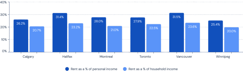 How to read this chart: Each city shows rent as a share of personal income and household income. The gap between the two reflects how renting is more affordable on two incomes instead of one. All income is measured as gross monthly income before taxes.