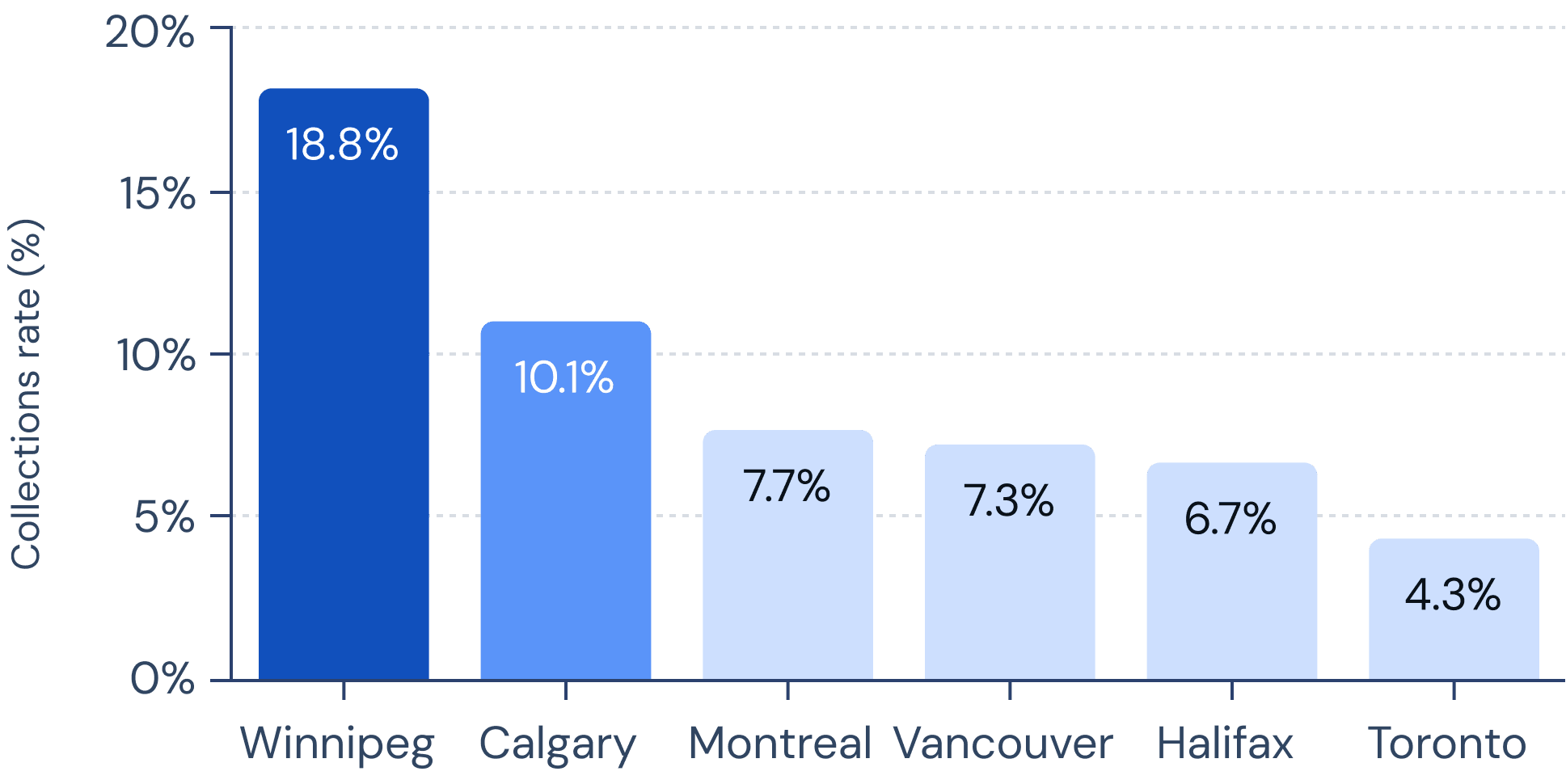 Calgary’s rates indicate higher-than-average debt strain despite relatively solid credit scores, while Montreal’s slightly lower scores and moderate collections suggest income-to-debt imbalances among renters.